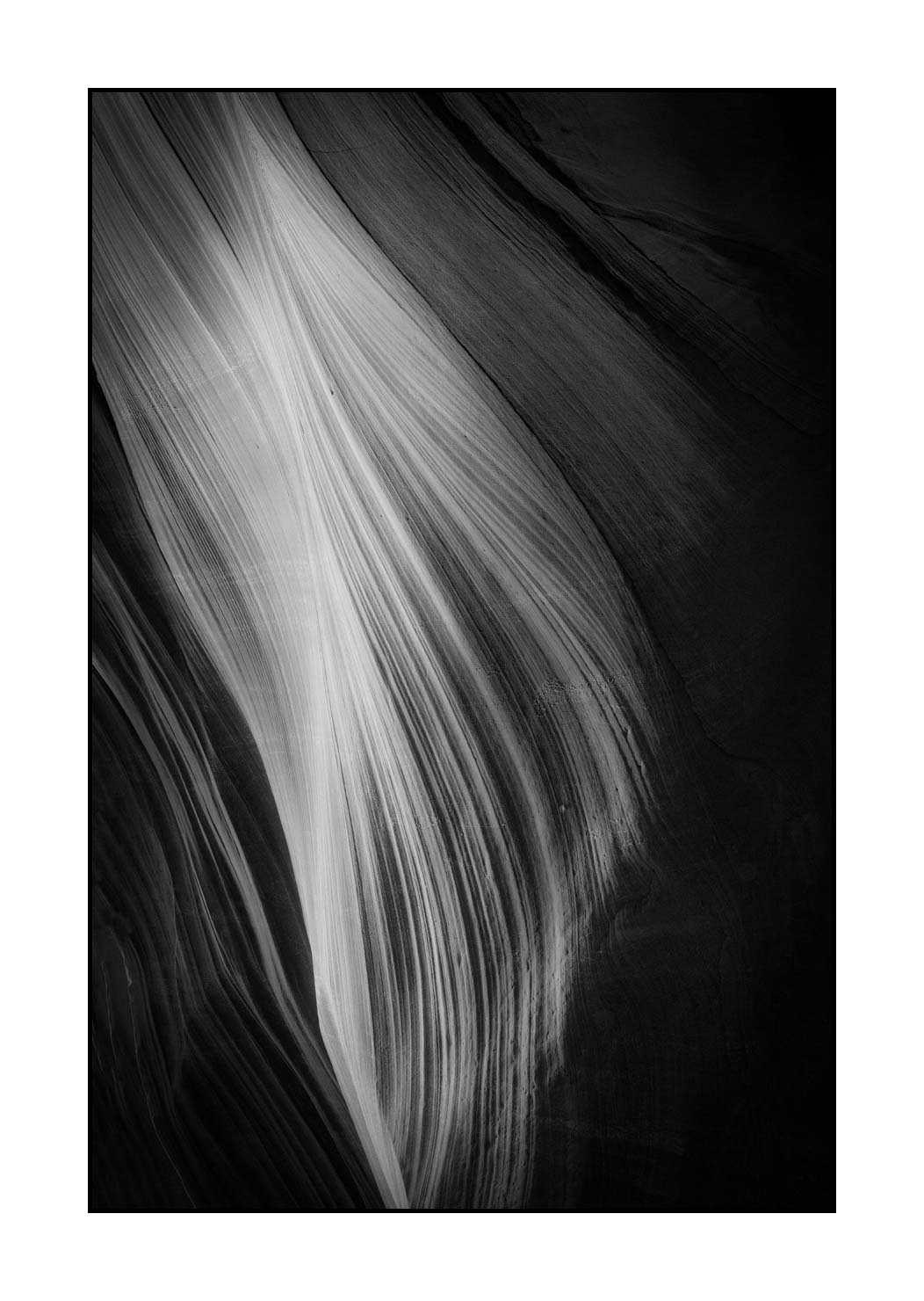 La photographie en noir et blanc est la technique la plus parfaite et la plus aboutie pour mettre en valeur la douceur des textures des voussures de Upper et Lower Antelope Canyon. Les jeux de lumière et d'ombres donnent presque envie de caresser le grain parfait de la roche. Je ressens presque toujours un rapport charnel avec ces décors minéraux.