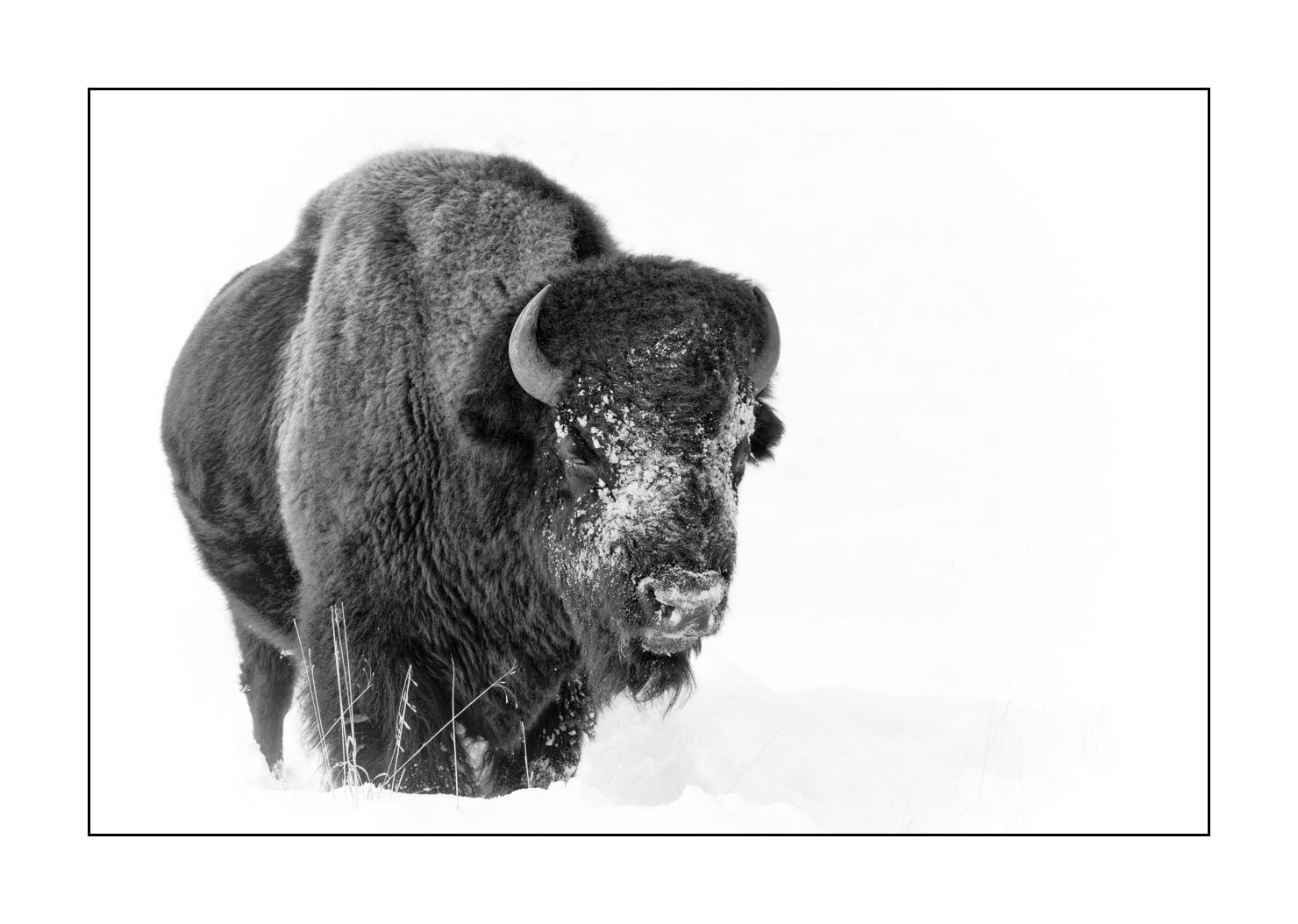 Le bison est facile à repérer dans la neige car sa masse foncée se détache facilement sur le blanc. Il symbolise l'abondance, la puissance. Quand le vent souffle à 60 kilomètres par heure et que les températures atteignent -30 degrés Celsius, les bisons se regroupent et ne bougent plus. Ils semblent indestructibles. Les éléments extrêmes ne semblent pas avoir d'emprise sur eux. C'est pour cette raison que j'aime les photographier pour mes tirages d'art.