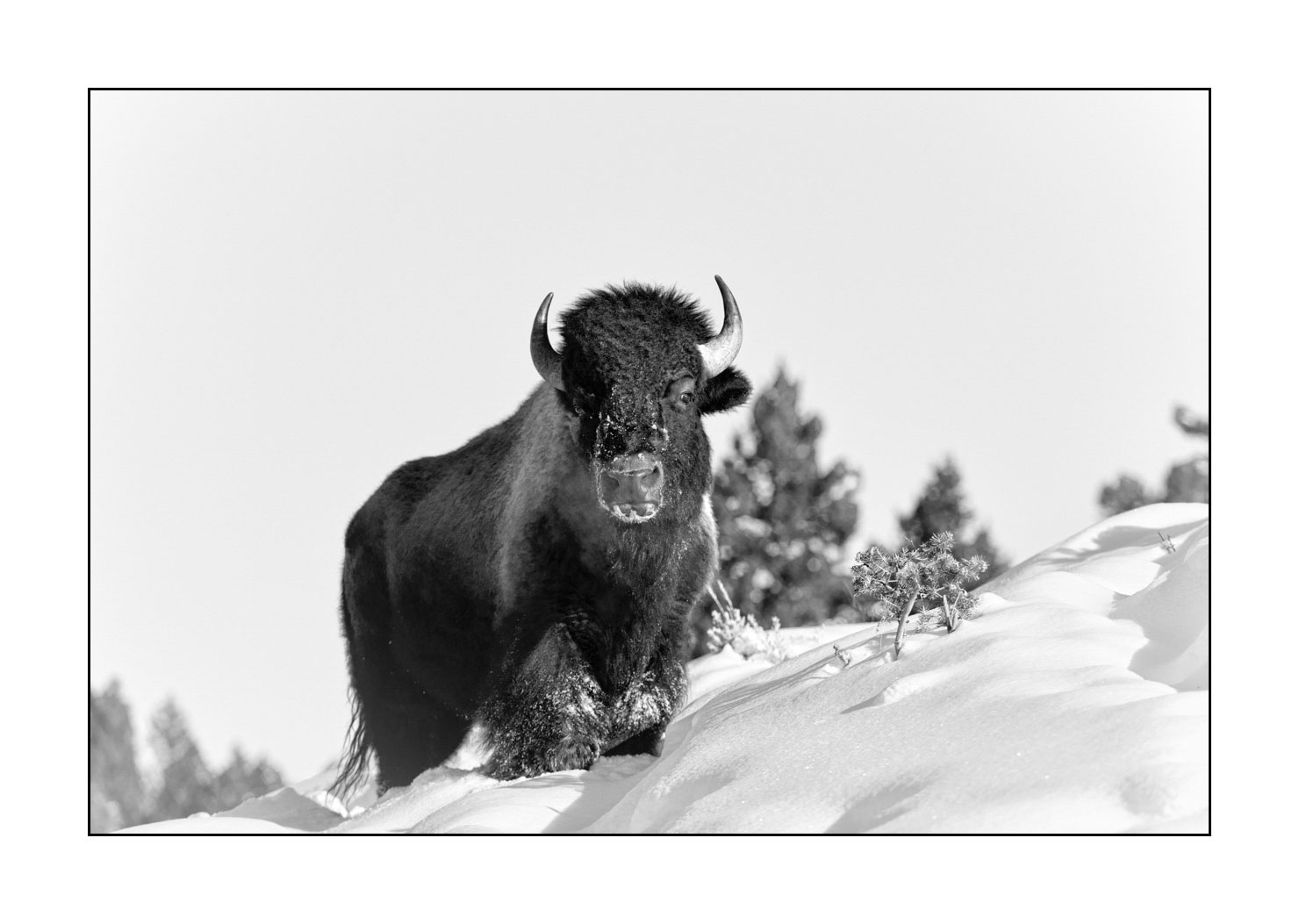 Le bison est facile à repérer dans la neige car sa masse foncée se détache facilement sur le blanc. Il symbolise l'abondance, la puissance. Quand le vent souffle à 60 kilomètres par heure et que les températures atteignent -30 degrés Celsius, les bisons se regroupent et ne bougent plus. Ils semblent indestructibles. Les éléments extrêmes ne semblent pas avoir d'emprise sur eux. C'est pour cette raison que j'aime les photographier pour mes tirages d'art.