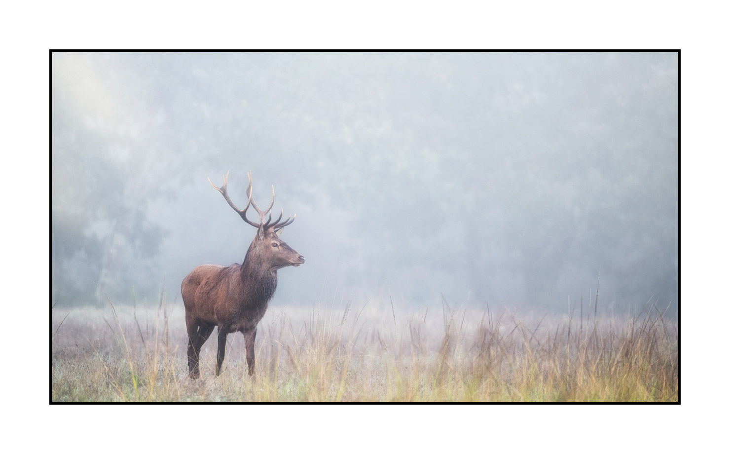 Cerf dans la brume XIV: Finition contemporaine Photo : 48cm x 27cm. Avec cadre : 61cm x 40cm.