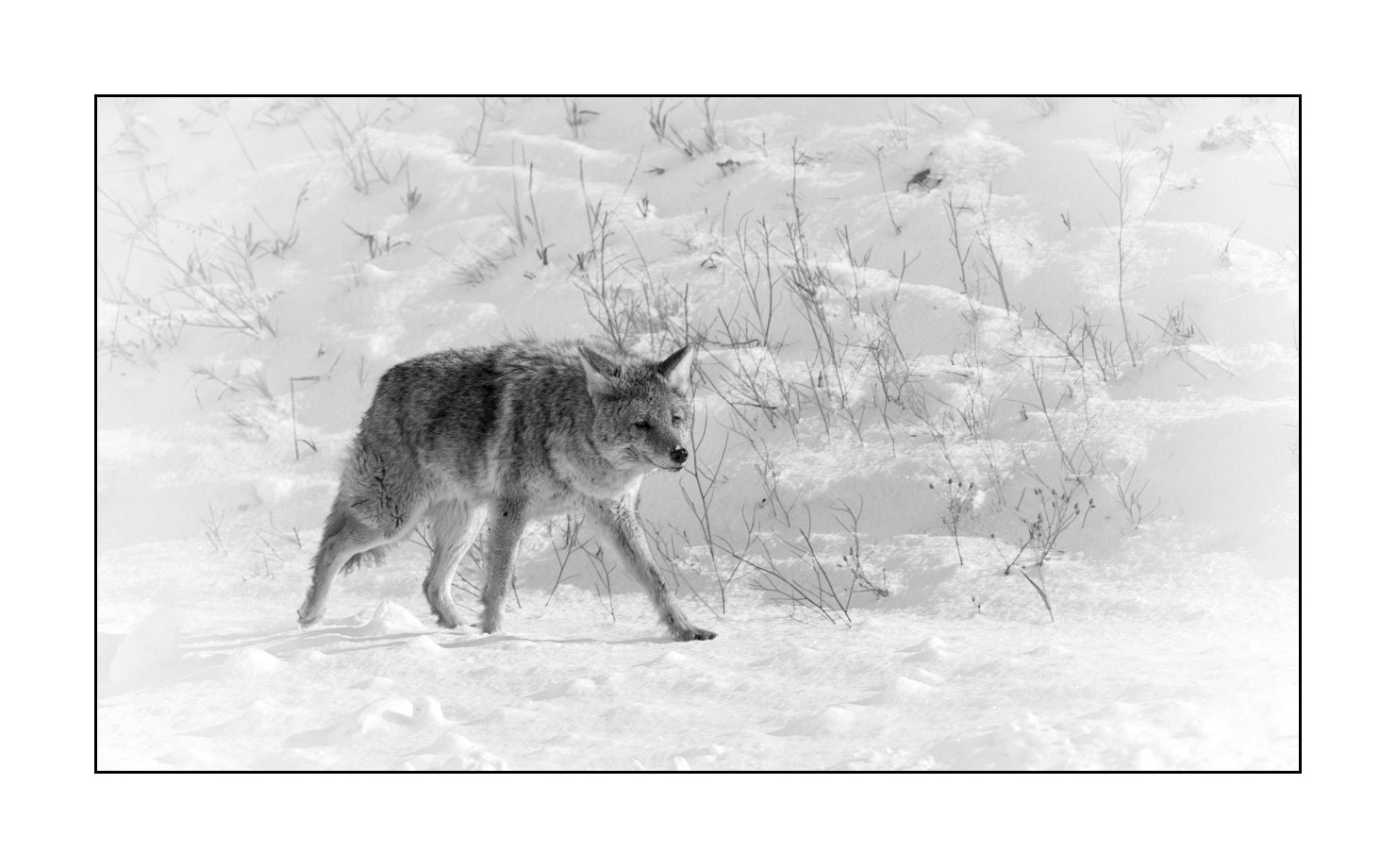 Coyote au Yellowstone II: Finition museum Photo : 80cm x 45cm. Avec cadre : 97cm x 62cm.