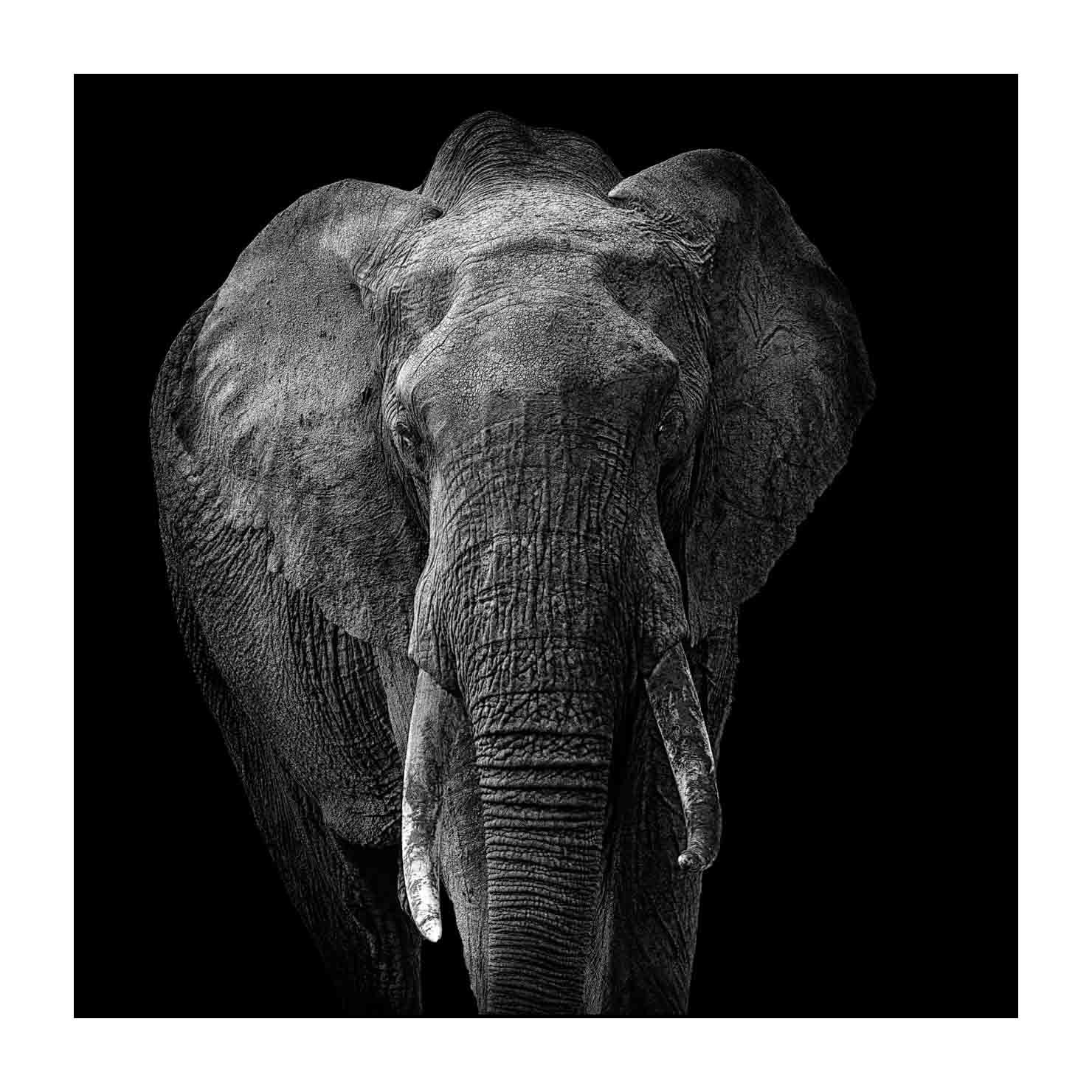 Eléphant en back to black I: Finition museum Photo : 50cm x 50cm. Avec cadre : 53cm x 53cm.