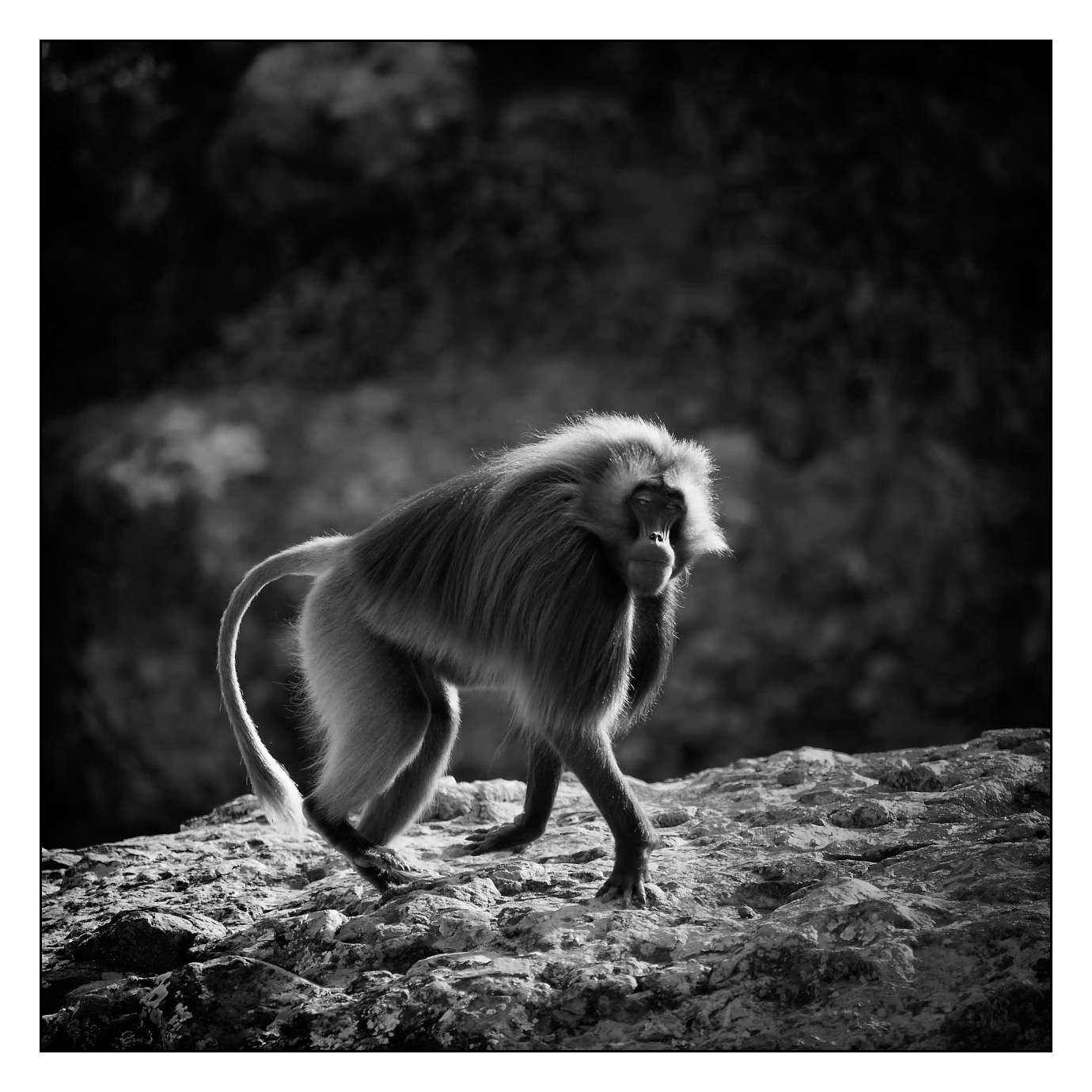 Cette collection de photographies en noir et blanc est consacrée aux geladas d’Ethiopie. C’est une espèce de singe qui vit sur les hauts plateaux de l’Ethiopie. Un gélada se nourrit exclusivement de graminées et de brins d’herbe ainsi que de racines. J’ai été surpris par leur délicatesse à créer des touffes d’herbe dans leurs mains pour les porter ensuite à leur gueule.