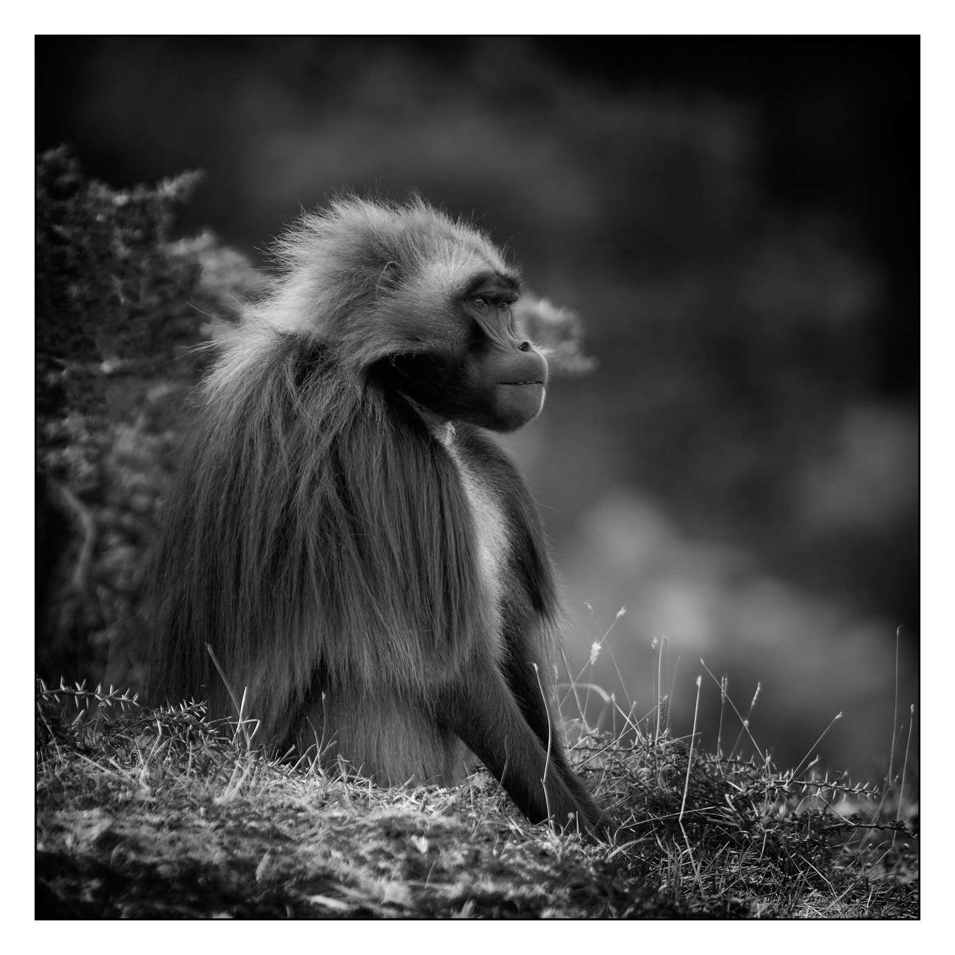 Cette collection de photographies en noir et blanc est consacrée aux geladas d’Ethiopie. C’est une espèce de singe qui vit sur les hauts plateaux de l’Ethiopie. Un gélada se nourrit exclusivement de graminées et de brins d’herbe ainsi que de racines. J’ai été surpris par leur délicatesse à créer des touffes d’herbe dans leurs mains pour les porter ensuite à leur gueule.