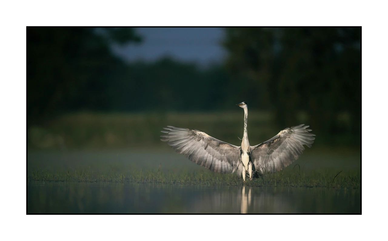Lorsque j'ai créé cette photo d'un oiseau dans la Dombes en France, j'ai souhaité évoquer un doux dialogue entre immobilité et liberté, où l'harmonie paisible de la nature rencontre le mouvement gracieux de la faune sauvage.