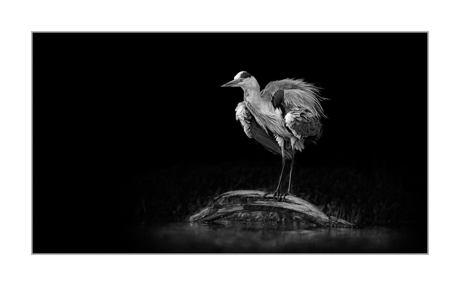 Héron cendré en back to black I: Finition contemporaine Photo : 48cm x 27cm. Avec cadre : 61cm x 40cm.