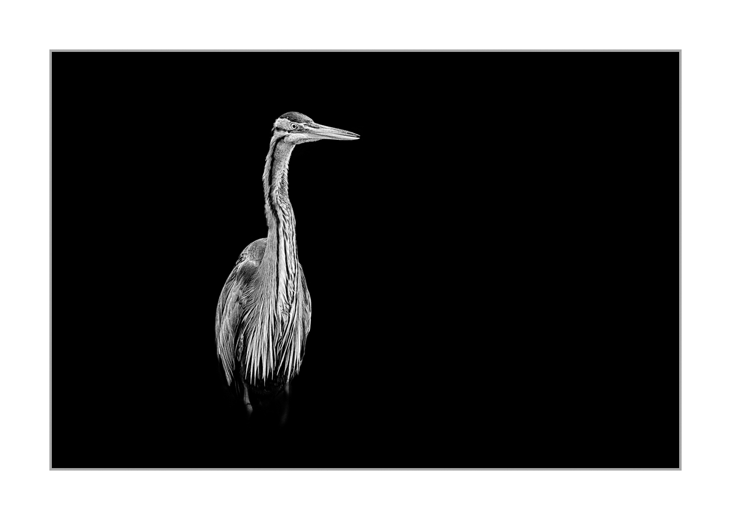 Héron pourpré en back to black III: Finition contemporaine Photo : 90cm x 60cm. Avec cadre : 93cm x 63cm.