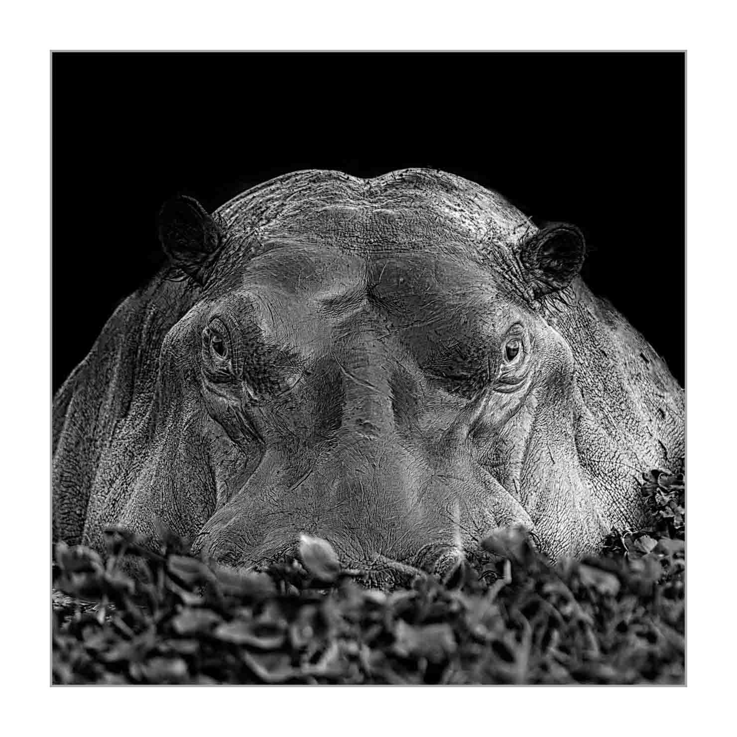 Hippopotamus in Back to Black I: Museum Finish Dim in inches - photo: 20 x 20. With frame: 27.1 x 27.1 / Dim in cm - photo: 51 x 51. With frame: 69 x 69.
