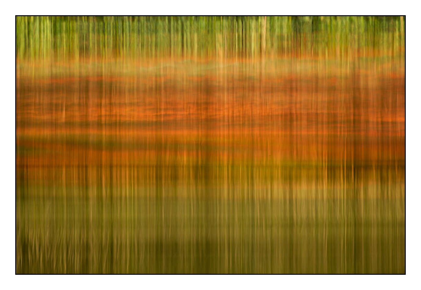 Toutes ces photographies artistiques ont été créées à partir de reflets d’arbres à la surface de l’eau. L’arbre symbolise l’enracinement, la stabilité, l’ancrage. Devenu flou, il reste malgré tout omniprésent. On le devine, l’aperçoit. Troncs et feuillages sont à la surface de l’eau, reflets d’eux-mêmes en couleur. L’image reflétée sur l’eau se déforme, dans un reflet lisse, sans aspérité. L’illusion se nourrit et tire sa force du flou.