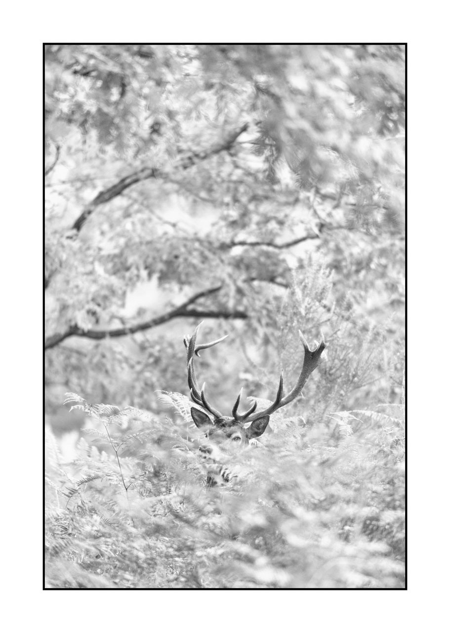 J'ai créé cette œuvre d'art pendant l'automne en Charente-Maritime, en France. C'était la saison du brame du cerf. C'était une journée parfaite avec des conditions météorologiques idéales. Mais, malheureusement, je n'ai pas eu beaucoup de chance avec mes photos. En effet, j'ai attendu des heures dans mon affût pour voir un cerf dans le pré devant moi. Lorsque le soleil fut trop haut pour faire de bonnes photos, j'ai décidé de rentrer à ma cabine. Lorsque je suis sorti de mon affût, j'ai entendu un petit bruit sur ma gauche. C'était un grand cerf élaphe qui me regardait. Je suppose qu'il dormait, et quand j'ai bougé en faisant du bruit, je l'ai réveillé. J'ai eu le temps d'ajuster mon appareil photo pour prendre quelques photos.