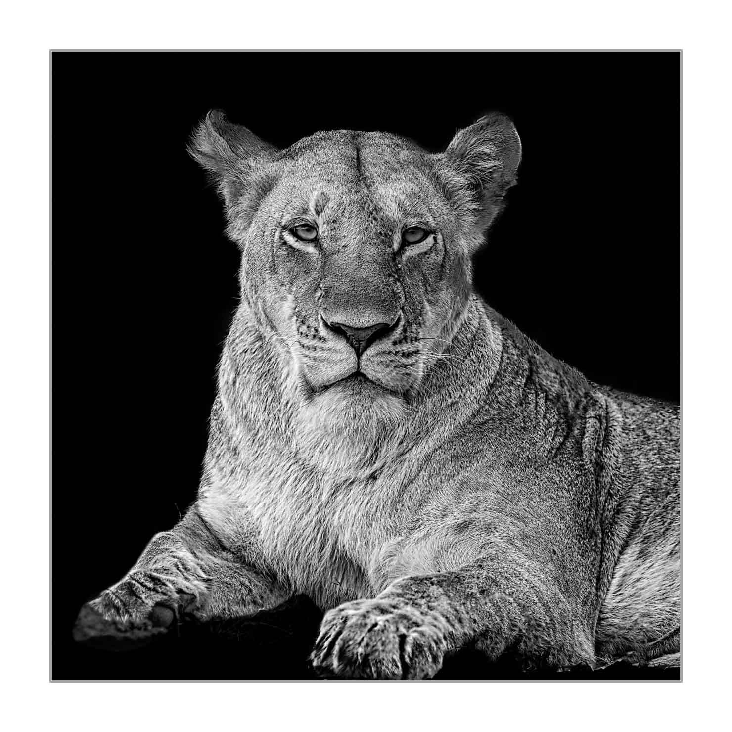 Lionne en back to black I: Finition contemporaine Photo : 30cm x 30cm. Avec cadre : 41cm x 41cm.