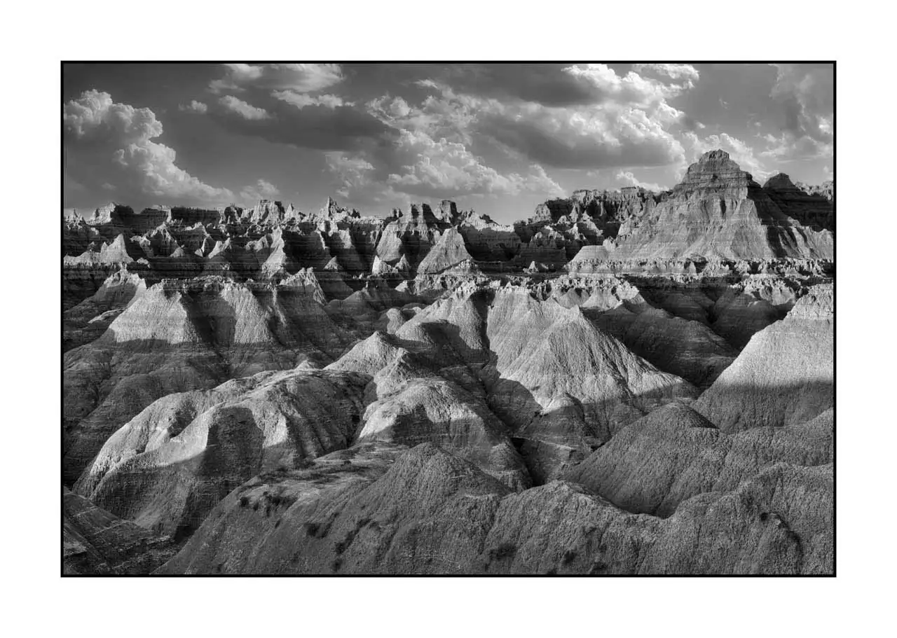 Écho du temps VII - Paysage en noir et blanc des Badlands dans le Dakota du Sud: Finition museum Photo : 30cm x 20cm. Avec cadre : 41cm x 31cm.