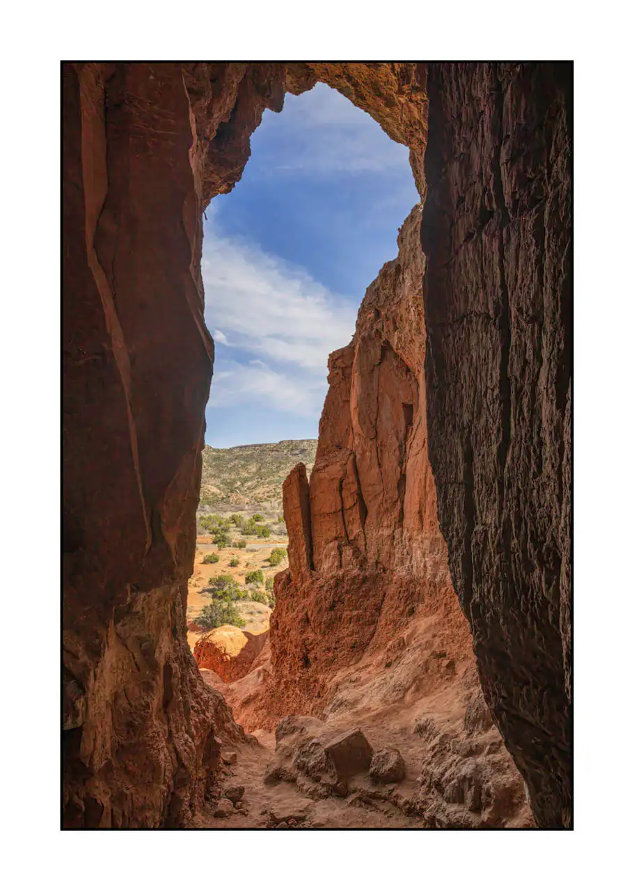 Paysage intemporel du canyon de Palo Duro VI - Big Cave: Finition museum Photo : 60cm x 40cm. Avec cadre : 73cm x 53cm.