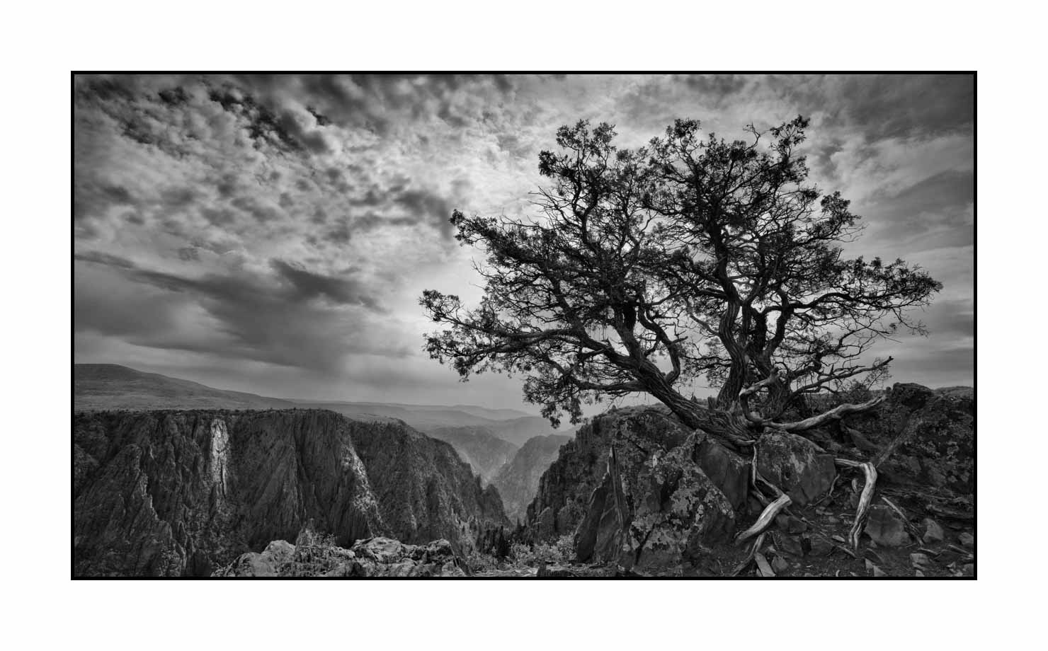 Dans cette collection de photos d'arts de paysages en noir et blanc, je vous propose aussi quelques arbres qui sont majestueux. J'ai eu la chance photographier le plus beau genévrier que j'ai vu dans le sud-ouest des Etats-Unis. Il porte le surnom « L'arbre que tout le monde aime ». Sa forme et son parfait état de conservation en fait un véritable modèle photographique. Il s'élève fièrement au-dessus du canyon. Le temps ne semble pas avoir d'emprise sur lui.