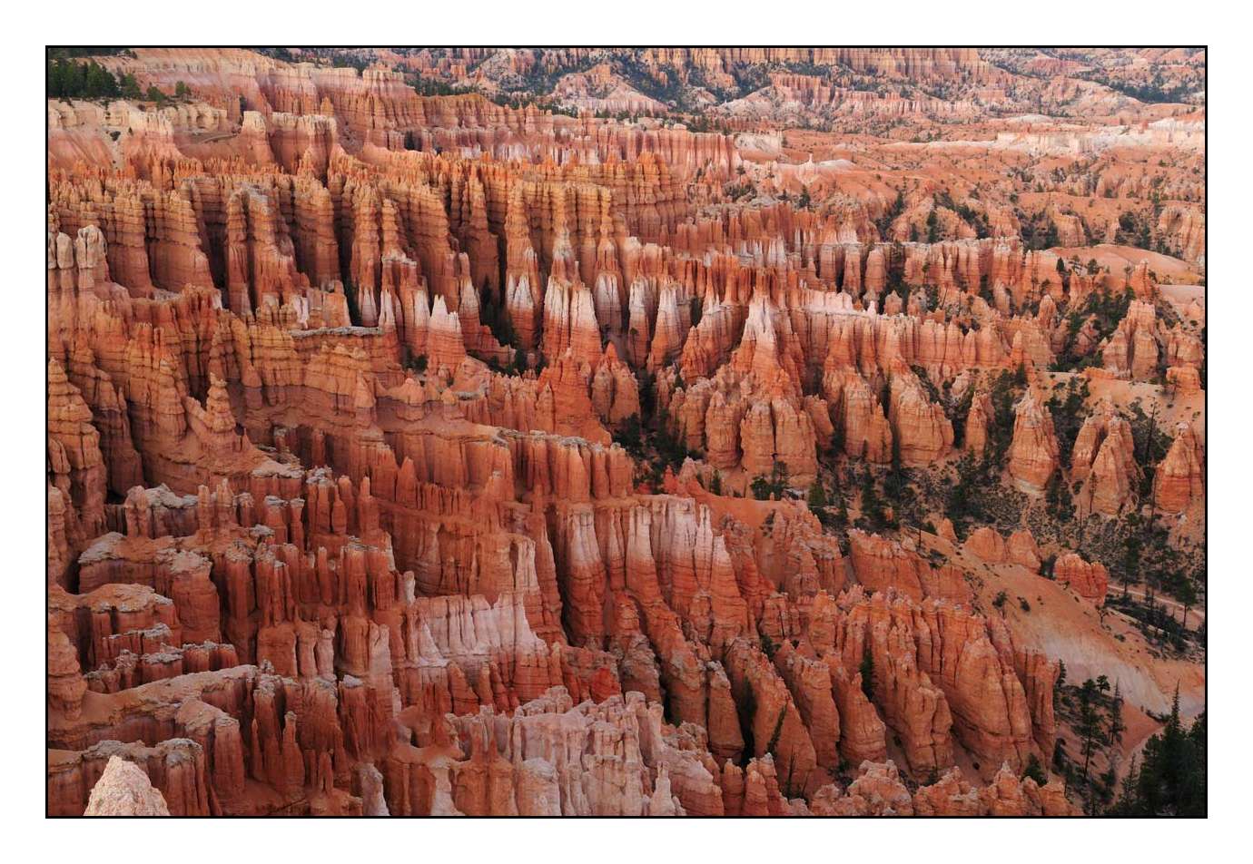 Les lumières rasantes de l’aube ou du crépuscule font rougeoyer les couleurs faisant penser que les batailles ont été rudes pour protéger le secret enfoui. Le sang versé lors des batailles est sans aucun doute un témoignage mais aussi un avertissement à tous les curieux qui souhaiteraient découvrir Bryce Canyon autrement qu’avec les yeux.