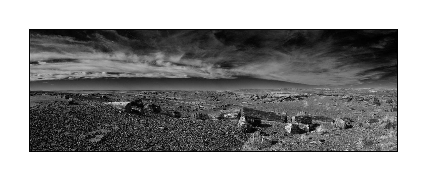 Paysage de Petrified Forest en Arizona en noir et blanc I: Finition museum Photo : 90cm x 30cm. Avec cadre : 93cm x 33cm.