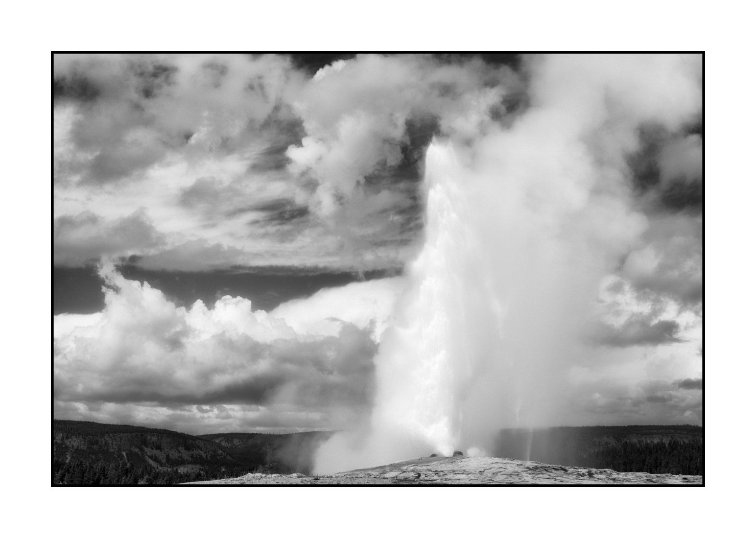 Paysage du Yellowstone dans le Wyoming en noir et blanc XXV. Le geyser de Old Faithful.: Finition museum Photo : 30cm x 20cm. Avec cadre : 33cm x 23,5cm.