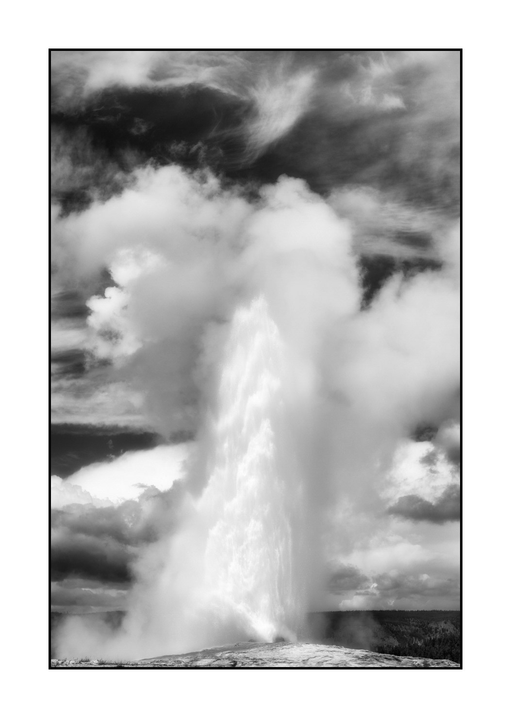 Paysage du Yellowstone dans le Wyoming en noir et blanc XXVI. Le geyser de Old Faithful.: Finition museum Photo : 30cm x 20cm. Avec cadre : 33cm x 23,5cm.