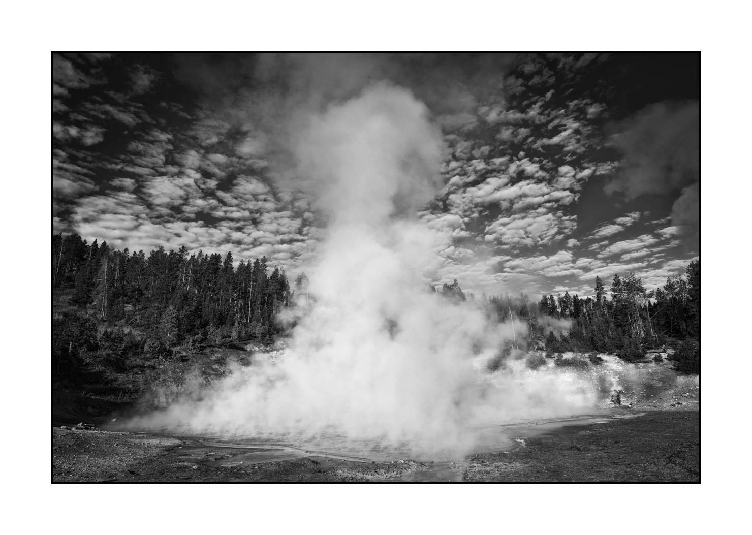 Paysage du Yellowstone dans le Wyoming en noir et blanc XXX. Un geyser à Mud Volcano.