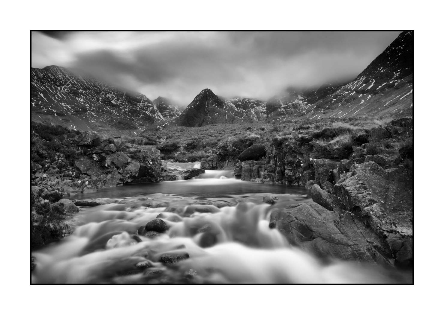 Les Fairy Pools, des bassins cristallins nichés au pied des Cuillins, transmettent une tranquillité sereine à travers la photographie en noir et blanc. En éliminant la distraction des couleurs, l'objectif se concentre sur la texture de l'eau, les reflets et les jeux de lumière. Cette approche artistique transporte le spectateur dans un monde où la magie des fées semble plausible, créant une connexion intime avec la nature.