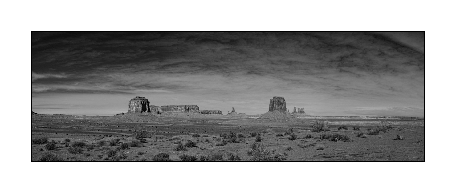 Paysage de Monument Valley en noir et blanc V: Finition museum Photo : 63cm x 21cm. Avec cadre : 74cm x 32cm.