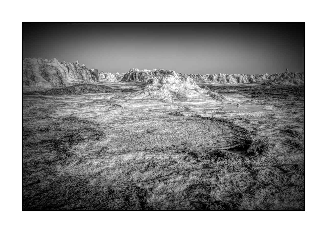 Pourtant, malgré cette profusion de couleurs, une certaine beauté éthérée émane du paysage désolé du Dallol. Pour capturer cette essence mystique, j'ai choisi de photographier ce site unique en noir et blanc. Les images résultantes évoquent une autre planète, avec des formations montagneuses qui semblent surgir d'un monde lointain. Les petits lacs ressemblent à des oasis perdues dans une étendue désertique, ajoutant une touche de mystère à ces photographies artistiques.