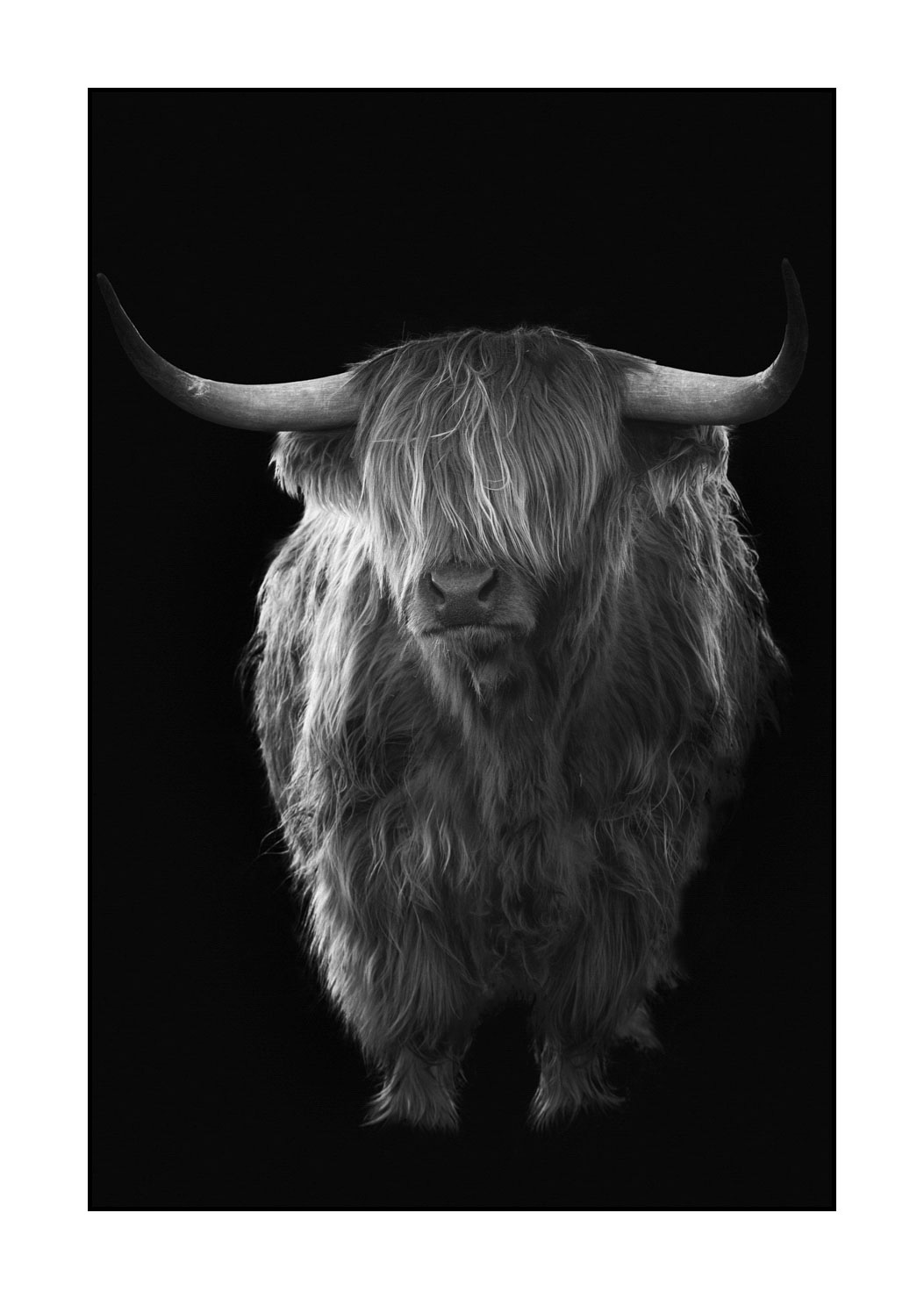 Portrait en noir et blanc d'une vache Highland en Ecosse IX: Finition museum Photo : 60cm x 40cm. Avec cadre : 63cm x 43cm.