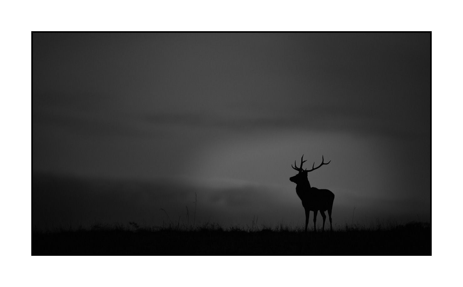 Une silhouette de cerfs en association avec le noir et blanc est bien plus qu’une photographie. Une silhouette est suggestive, évocatrice mais elle est aussi porteuse d’un message de sérénité, de calme et de quiétude. Elle m’oblige à aller au-delà de l’interprétation de la simple composition et de considérer la scène comme un ensemble construit pour véhiculer un message précis. La nudité de la silhouette est pour moi une technique créative qui provoque le questionnement, l’introspection. Les regards si importants en photographie animalière sont totalement absents. Je ne suis plus hypnotisé par les yeux. Je dois me focaliser sur le corps, l’élégance.