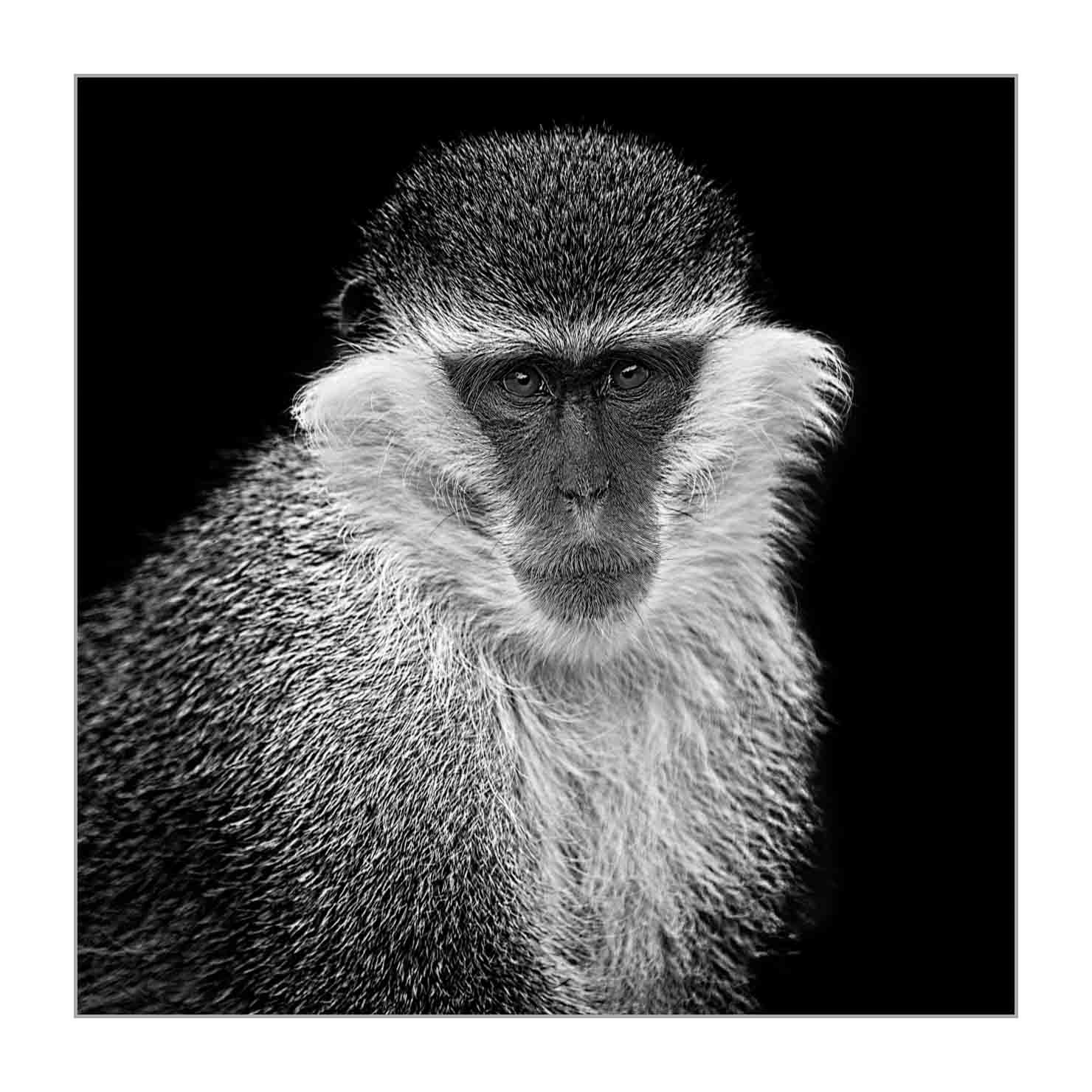 Vervet bleu en back to black I: Finition museum Photo : 50cm x 50cm. Avec cadre : 53cm x 53cm.