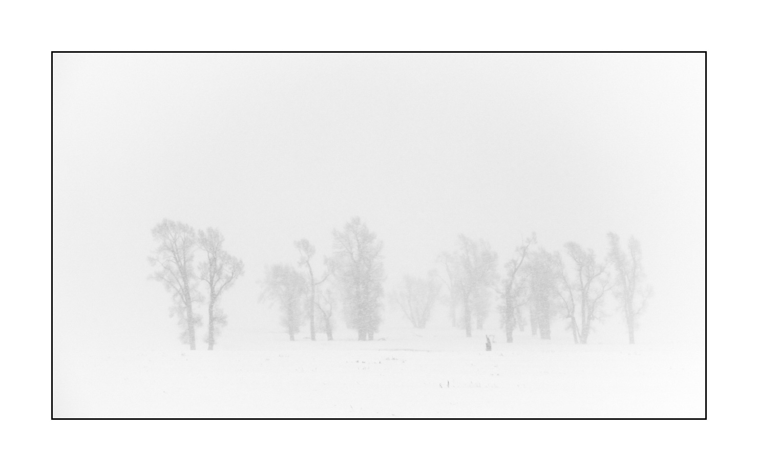 Les arbres que j'ai choisi de montrer sont souvent seuls, isolés dans un manteau neigeux immaculé. J'ai voulu évoqué la solitude mais aussi la force et la résistance quand les éléments naturels sont rudes. Les températures dans le Yellowstone peuvent descendre à -45 degrés Celsius pendant l'hiver. Pourtant les arbres survivent et résistent à ces températures extrêmes.